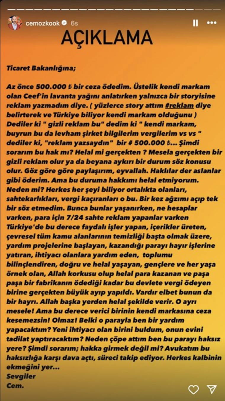 Sosyal medyada yayınladığı temizlik videolarıyla tanınan sosyal medya fenomeni Cem Özkök ürün tanıtımı yaparken ’reklam’ ibaresini kullanmadığı için 500 bin TL para cezasına çarptırıldı.