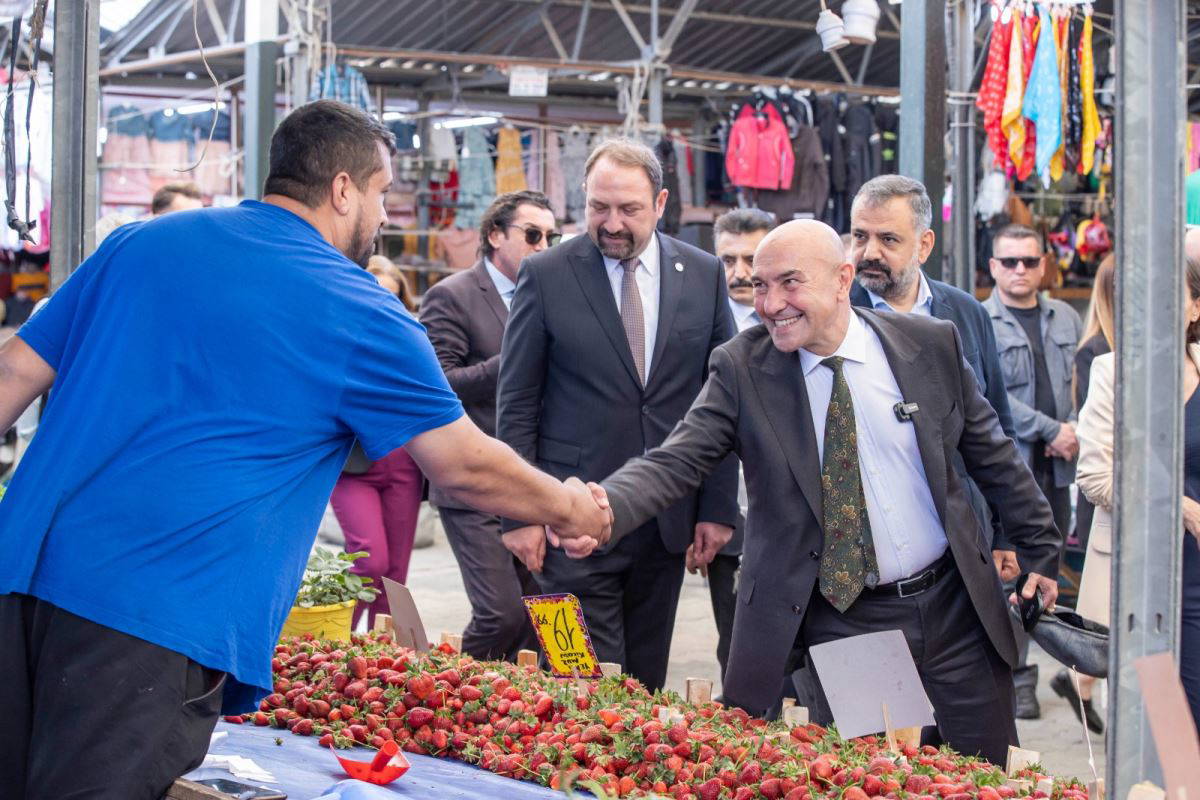 Başkan Soyer ile beraberindeki heyet, Bergama CHP İlçe Başkanlığı önünden vatandaşlarla bayraklar eşliğinde yürüyüş yaptı ve esnaf ziyareti yaptı. Bergama programı kapsamında kurulan pazaryerinde Bergamalılarla bir araya gelindi.