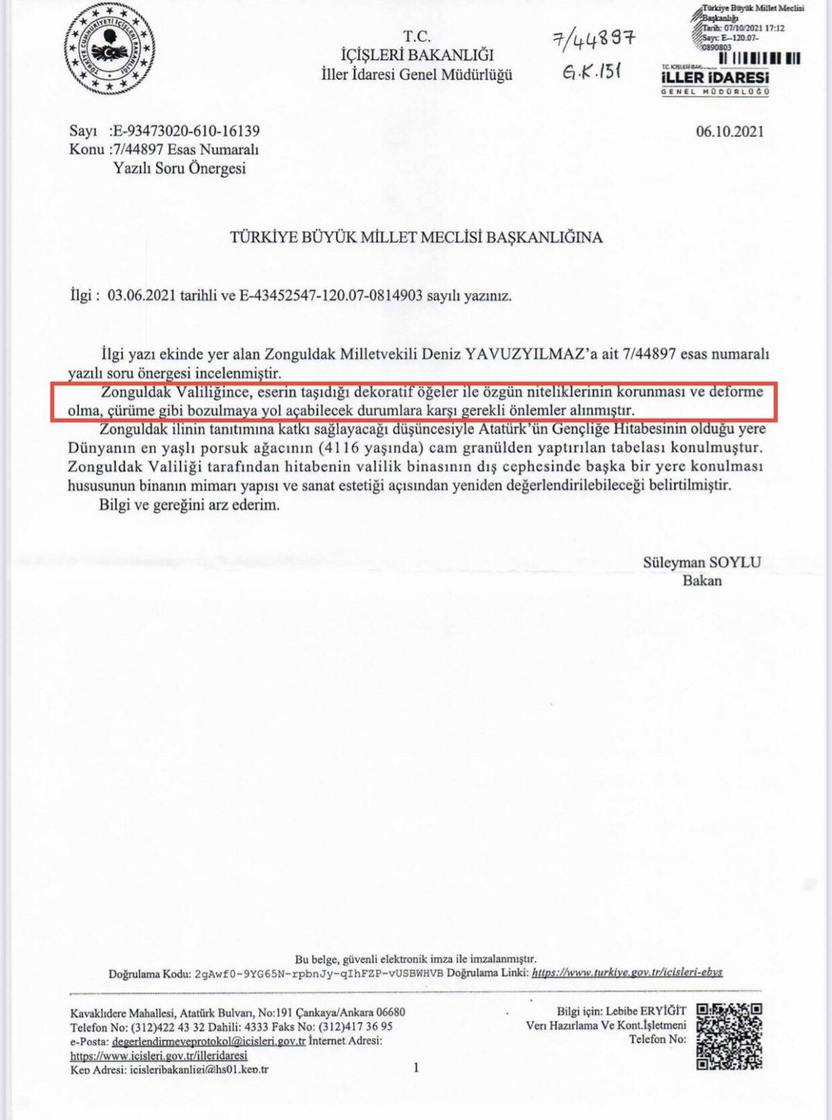 Soylu'dan gelen yanıtta, "Zonguldak Valiliğince, eserin taşıdığı dekoratif öğeler ile özgün niteliklerinin korunması ve deforme olma, çürüme gibi bozulmaya yol açabilecek durumlara karşı gerekli önlemler alınmıştır. Zonguldak ilinin tanıtımına katkı sağlayacağı düşüncesiyle Atatürk'ün Gençliğe Hitabesi'nin olduğu yere dünyanın en yaşlı porsuk ağacının (4116 yaşında) cam granülden yaptırılan tabelası konulmuştur. Zonguldak Valiliği tarafından hitabenin valilik binasının dış cephesinde başka bir yere konulması hususunun binanın mimari yapısı ve estetiği açısından yeniden değerlendirilebileceği belirtilmiştir" denilmişti.