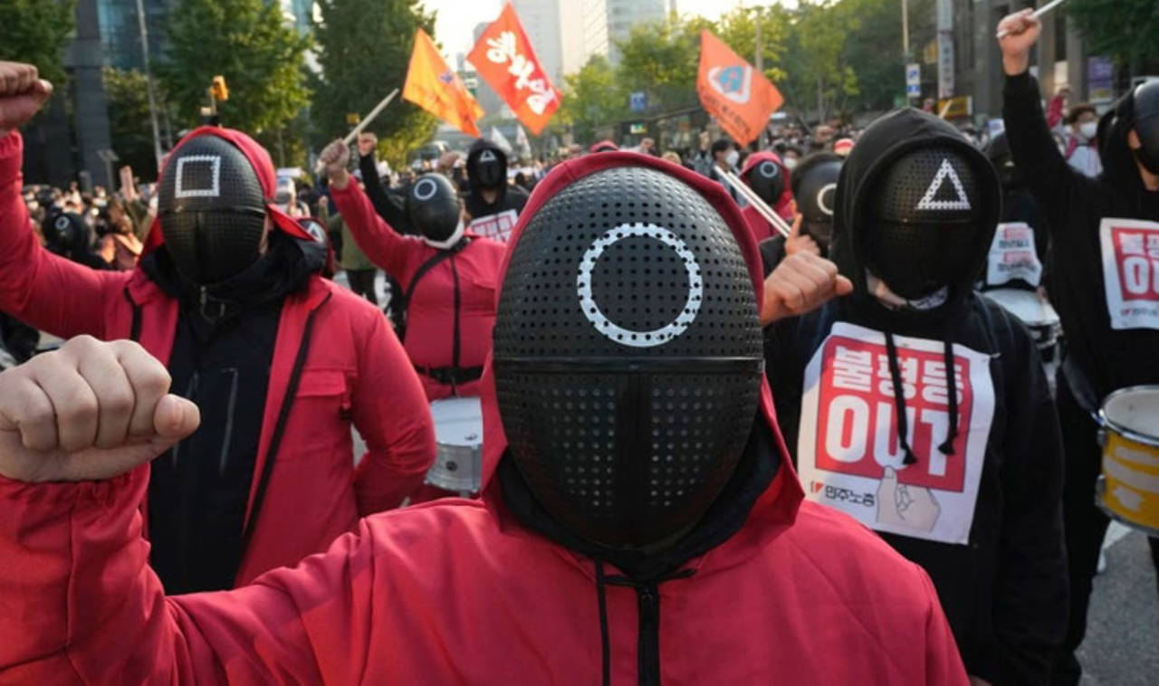 Dünya genelinde izlenme rekorları kıran “Squid Game” adlı dizi çekildiği ülkedeki işçileri sokaklara döktü. Güney Kore’de dizinin karakterleri gibi giyinen on binlerce işçi ülke genelinde protesto düzenledi.