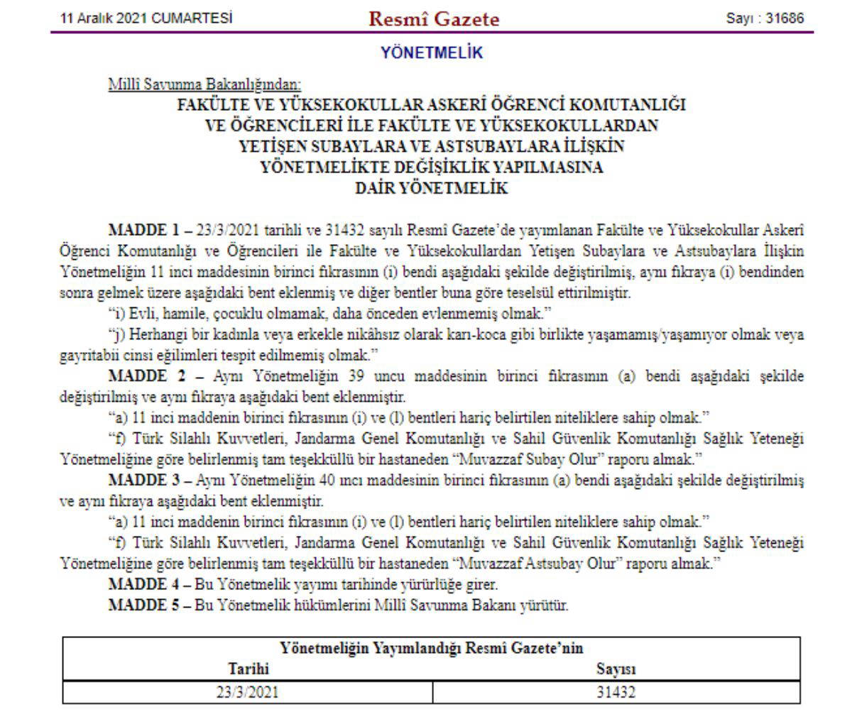 Yüksekokullardan Yetişen Subay ve Astsubaylara İlişkin Yönetmelikteki “Fakülte ve yüksekokulları kendi nam ve hesaplarına bitiren subay adayları ile yedeksubaylık hizmetleri sırasında müracaat edenlerde aranacak nitelikler” arasından “Evli, hamile, çocuklu, daha önceden evlenmemiş olmak” şartı kaldırıldı. Buna göre sivil üniversitelerden mezun kişilerin yedeksubaylıktan subaylığa geçiş başvuruları yapmaları durumunda evlenmemiş olma şartı aranmayacak.
