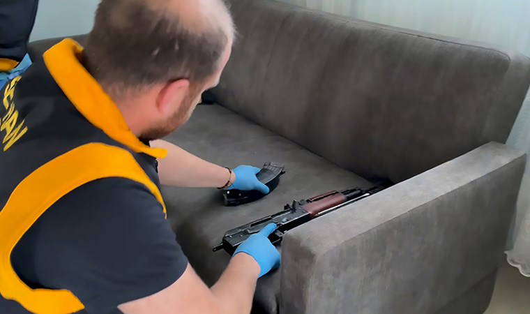 Çiftlik evinde arama yapan polis, giysi dolabına saklanan Kalaşnikof piyade tüfeği, 2 şarjör ve 85 mermi, ruhsatsız 4 tabanca, 2 pompalı tüfek ve bu silahlara ait 169 fişek, çelik yelek, hassas terazi, 12 uyuşturucu hap ile 6,8 gram esrar ele geçirdi.