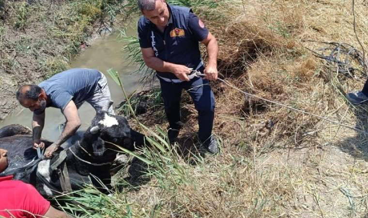 Sulama kanalında düşen ineği itfaiye kurtardı