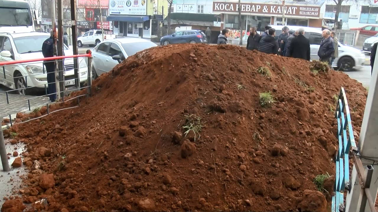 Dükkan sahibi Salih Yılmaz kiracısının dükkandan çıkmasını istemesi üzerine aralarında tartışma yaşandı. Bugün sabah saatlerinde dükkan sahibi Yılmaz, hafriyat kamyonu dolusu toprağı dükkanın önüne döktürdü.