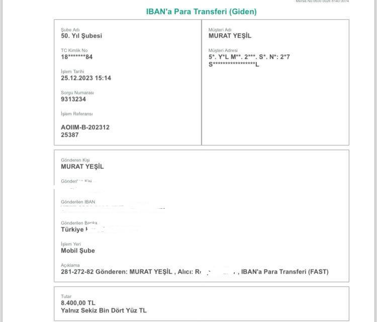Görüştüğü kişi, Yeşil'in kimlik bilgilerini istedi. Yeşil, kimlik bilgilerini mesaj yoluyla görüştüğü kişiye iletti. Yeşil'in araç kiralamak için uygun olduğunu belirten telefondaki kişi, 1 aylık ücretin kendisine iletilen hesap numarasına göndermesini istedi.