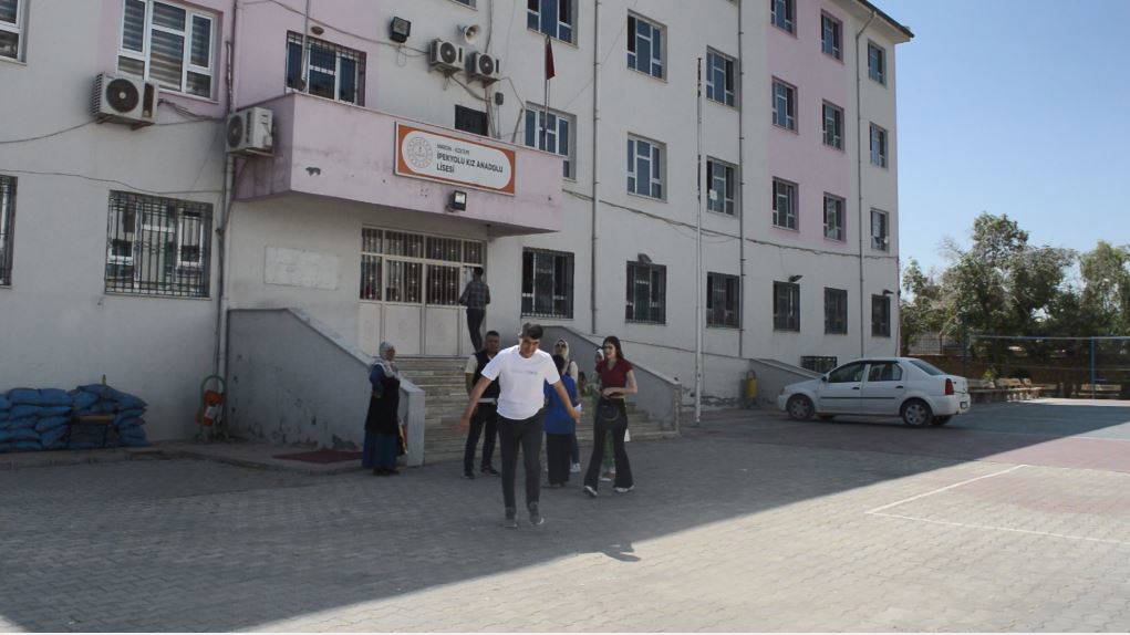 Suriye’de görev yapan iki askeri personel YKS sınavının ilk oturumu TYT’ye girmek için Kızıltepe ilçesindeki İpekyolu Kız Anadolu Lisesi’ne 09.59’da geldi.