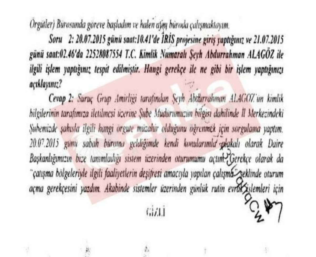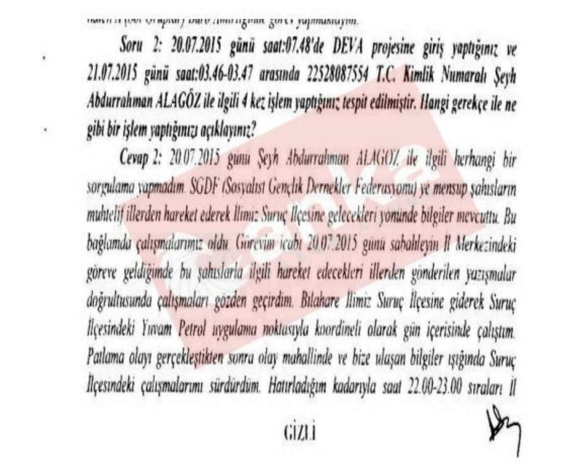 “Suruç Grup Amirliği tarafından Şeyh Abdurrahman Alagöz’ün kimlik bilgileri tarafımıza iletilmesi üzerine, şube müdürümüzün bilgisi dahilinde, il merkezimizdeki şubemizde şahısla ilgili hangi örgüte müzahir olduğunu öğrenmek için sorgulama yaptım. 20 Temmuz 2015 günü sabah büroma geldiğimde, kendi konularımla alakalı olarak da Başkanlığımızın bize tanımladığı sistem üzerinden oturumu açtım. Gerekçe olarak da ‘Çatışma bölgeleriyle ilgili faaliyetlerin deşifresi amacıyla yapılan çalışma’ şeklinde oturum açma gerekçesi yazdım. Akabinde, sistemler üzerindeki günlük rutin evrak işlemleri için sorgulama yaptım. Patlama akabinde de patlama ile ilgili çalışmalar yaptım.”