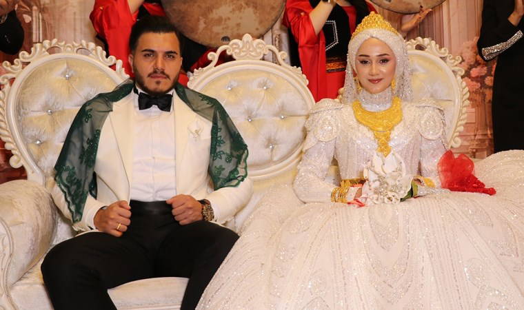 Yurtiçi ve yurtdışından yaklaşık 7 bin kişinin katılım sağladığı düğün töreni, son dönemlerin en yoğun katılımlı düğünü olurken, gelin ve damada takılan takılar dudak uçuklattı.