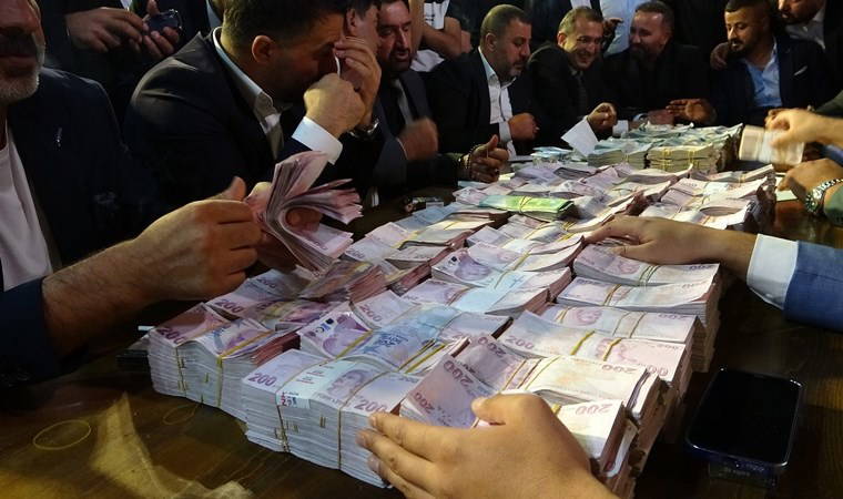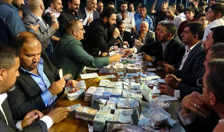 4 saat süren takı sonunda damada 12 milyon TL nakit, geline ise 3 kilo altın takılırken, masaya konulan paraları ise 15 kişi saydı.