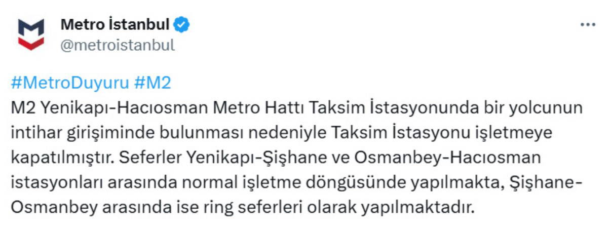 "M2 Yenikapı-Hacıosman Metro Hattı Taksim İstasyonu, bir yolcunun intihar girişiminde bulunması nedeniyle işletmeye kapatılmıştır. Seferler Yenikapı-Şişhane ve Osmanbey-Hacıosman istasyonları arasında normal işletme döngüsünde yapılmakta, Şişhane-Osmanbey arasında ise ring seferleri olarak yapılmaktadır."