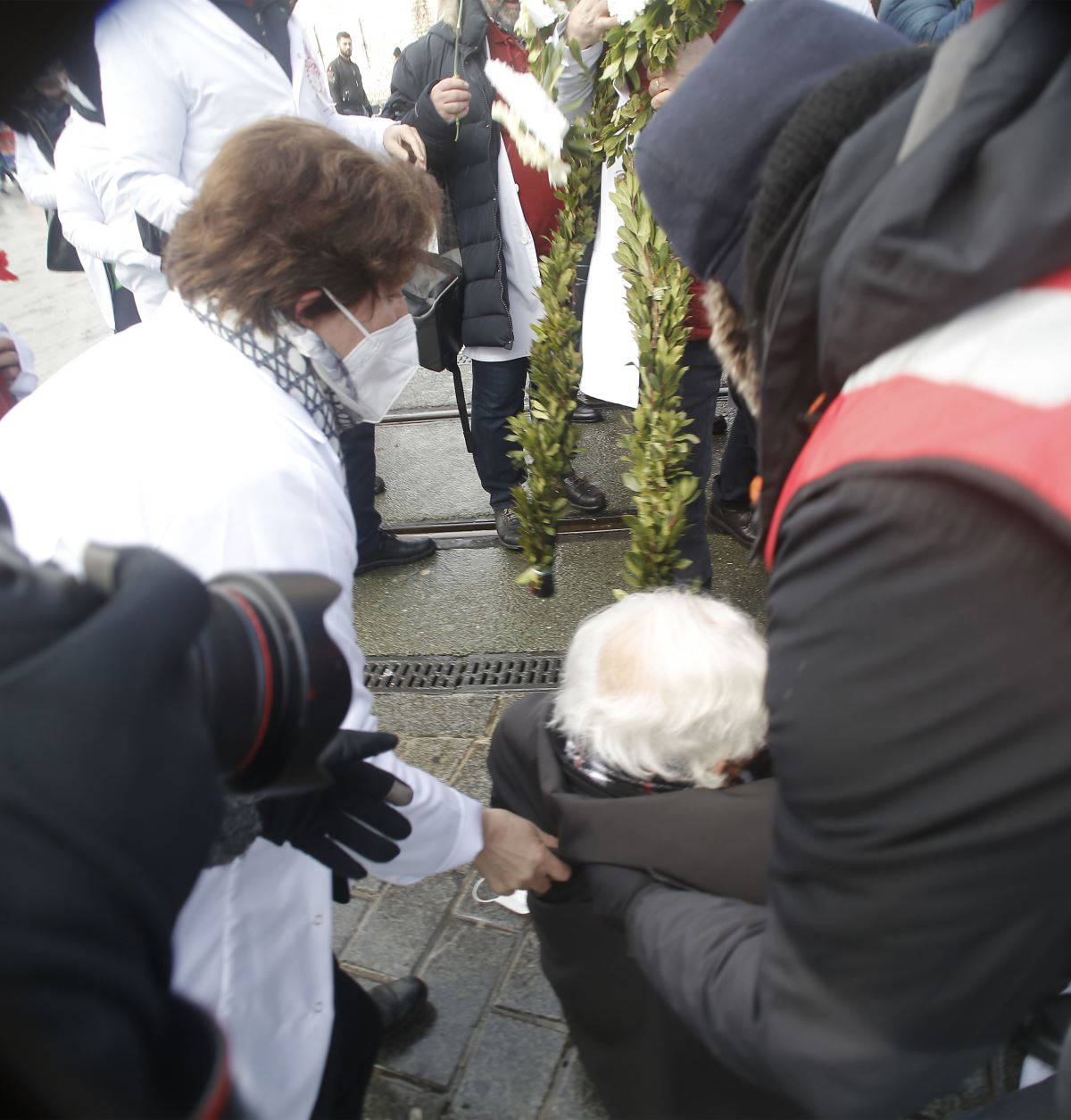Meydanda basın açıklaması yapılmasının yasak olduğunu gerekçe göstererek doktorları anıta sokmayan polis, sadece çelenk koymak isteyenlerin içeri girebileceğini söyledi. Bu sırada, içeri girmek isteyen doktorlara polis sert müdahalede bulundu. Müdahale sırasında 89 yaşındaki Op. Dr. Erdinç Köksal yere düştü.