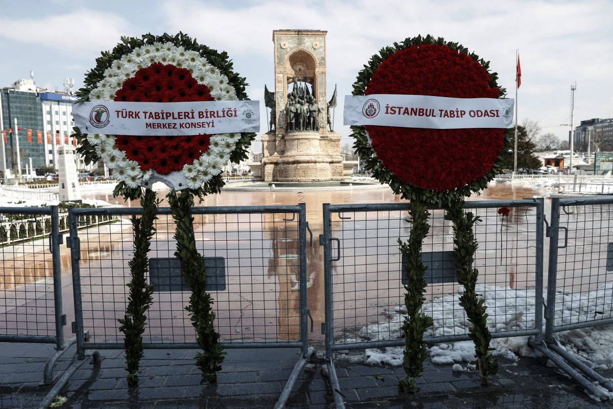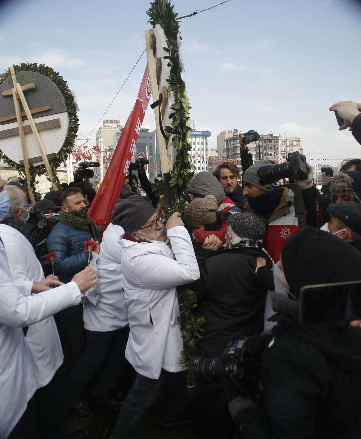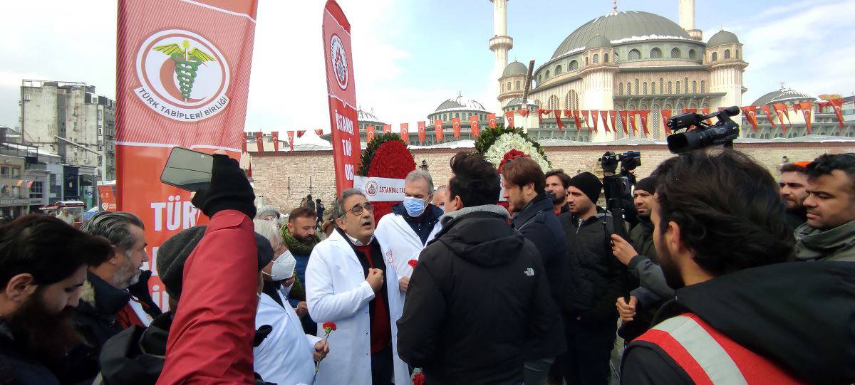 Türk Tabipleri Birliği (TTB) İstanbul Tabip Odası üyesi doktorlar, 14 Mart Tıp Bayramı nedeniyle, Cumhuriyet Anıtı'na çelenk bırakmak için Taksim Meydanı'nda bir araya geldi. Çelenk töreninden sonra basın açıklaması yapacaklarını belirten doktorlar, demir bariyerlerle kapatılan anıt alanına girmek isterken polis tarafından durduruldu.
