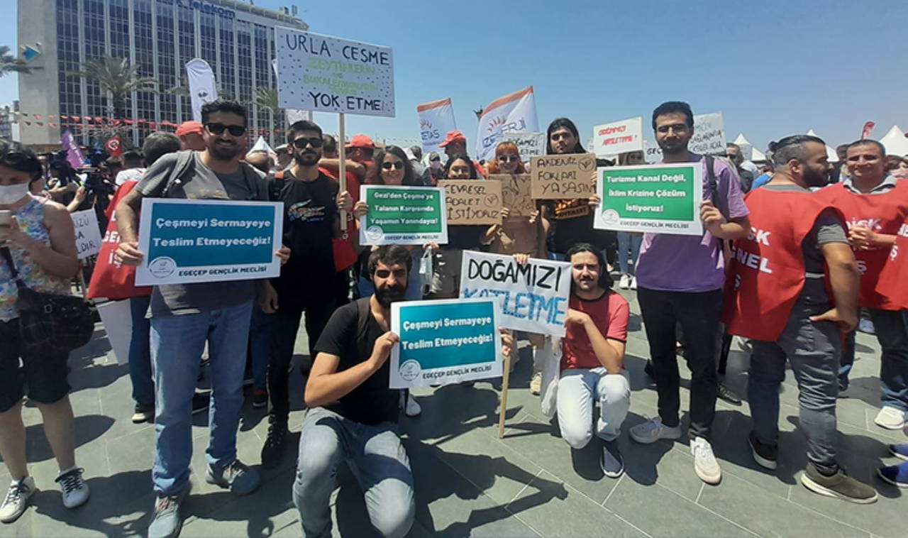 Cumhuriyet Meydanı'nda, düzenlenen ‘Çeşme talan projesine hayır’ mitingine İzmir Büyükşehir Belediye Başkanı Tunç Soyer, CHP Genel Başkan Yardımcısı Kahramanmaraş Milletvekili Ali Öztunç, CHP İl Başkanı Deniz Yücel, CHP İzmir milletvekilleri, Çeşme Belediye Başkanı Ekrem Oran ve CHP'li ilçe belediye başkanlarının yanı sıra İzmir Barosu, İzmir Tabip Odası, Ege Çevre ve Kültür Platformu (EGEÇEP), Devrimci İşçi Sendikaları Konfederasyonu (DİSK), Kamu Emekçileri Sendikaları katıldı. Yüzlerce kişinin katıldığı eylemde “Bu kentin emekçileri Çeşme talan projesine hayır diyor" pankartı taşındı. Eyleme katılanlar, ‘Ranta teslim olmayacağız’, ‘Çeşme halkındır halkın kalacak’ sloganları attı.