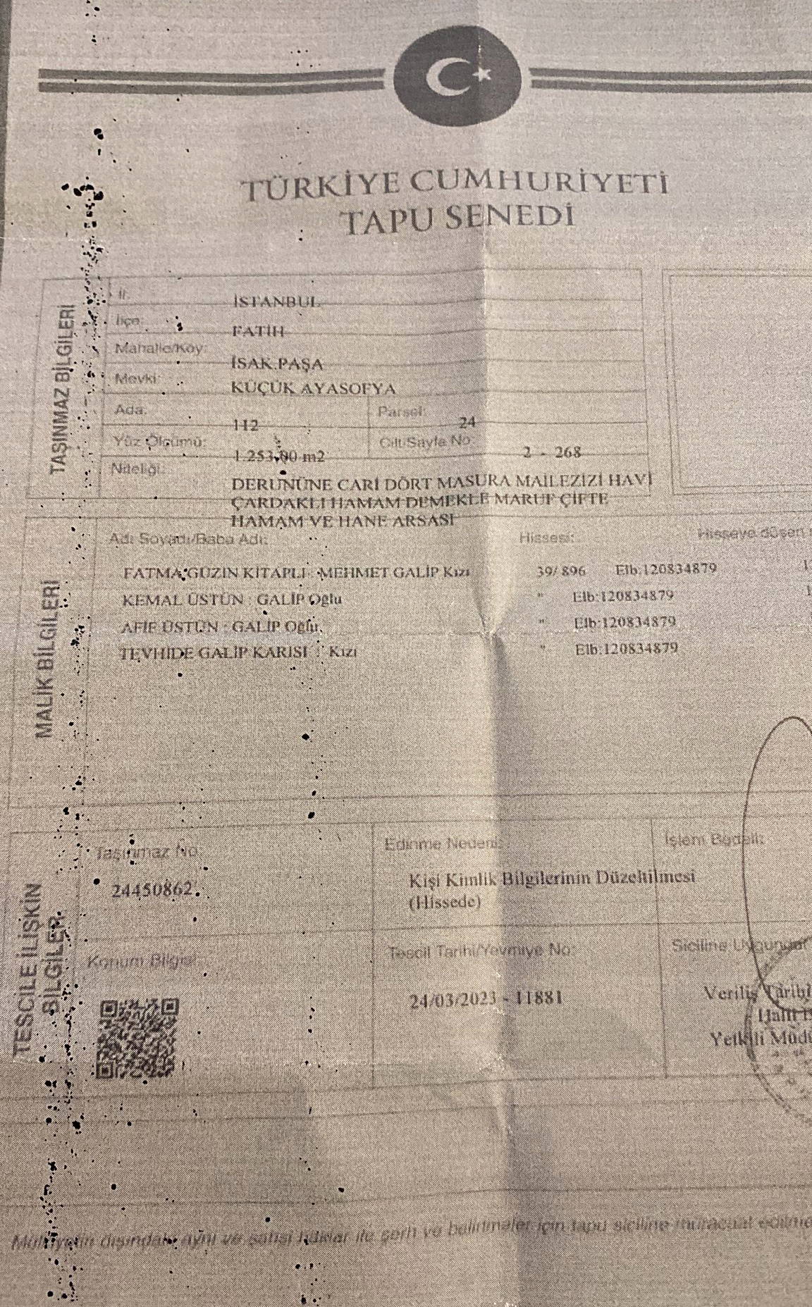 Bu kararların ardından tüm mirasçılar adına yapılan başvuru üzerine Fatih Tapu Müdürlüğü'nce nüfus kayıt güncellemeleri ve ilgili diğer tüm işlemler tamamlanıp, 24 Mart 2023 tarihi itibarıyla 2 alanla ilgili tapular tescil ve teslim edildi.