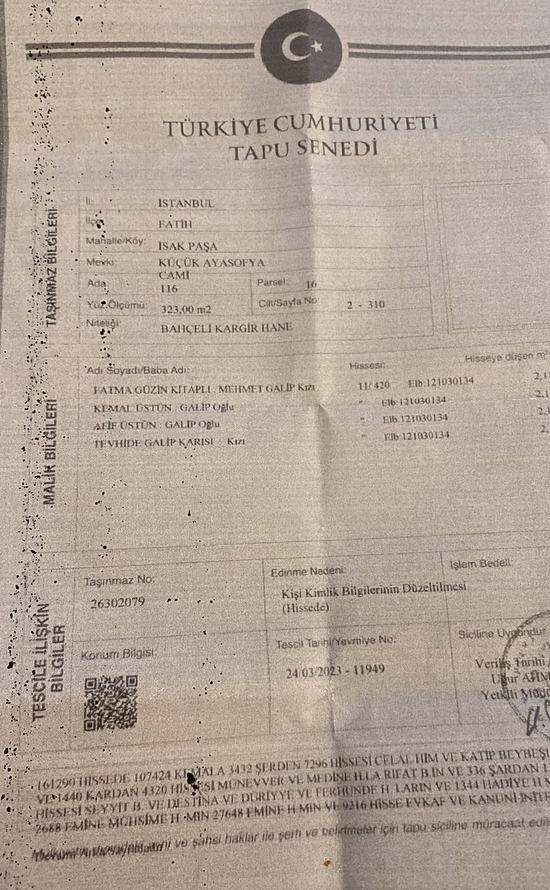 En son geçen yıl şubat ayında sonuçlanan davanın ardından 16 hissedar adına Fatih Tapu Müdürlüğü'ne başvuru yapıldığını belirten Dokuzoğlu Can, isim düzenlemeleri ve güncellemeler gibi işlemlerin tamamlanarak, 24 Mart'ta hissedarlar adına tapularının tescil edildiğini kaydetti.