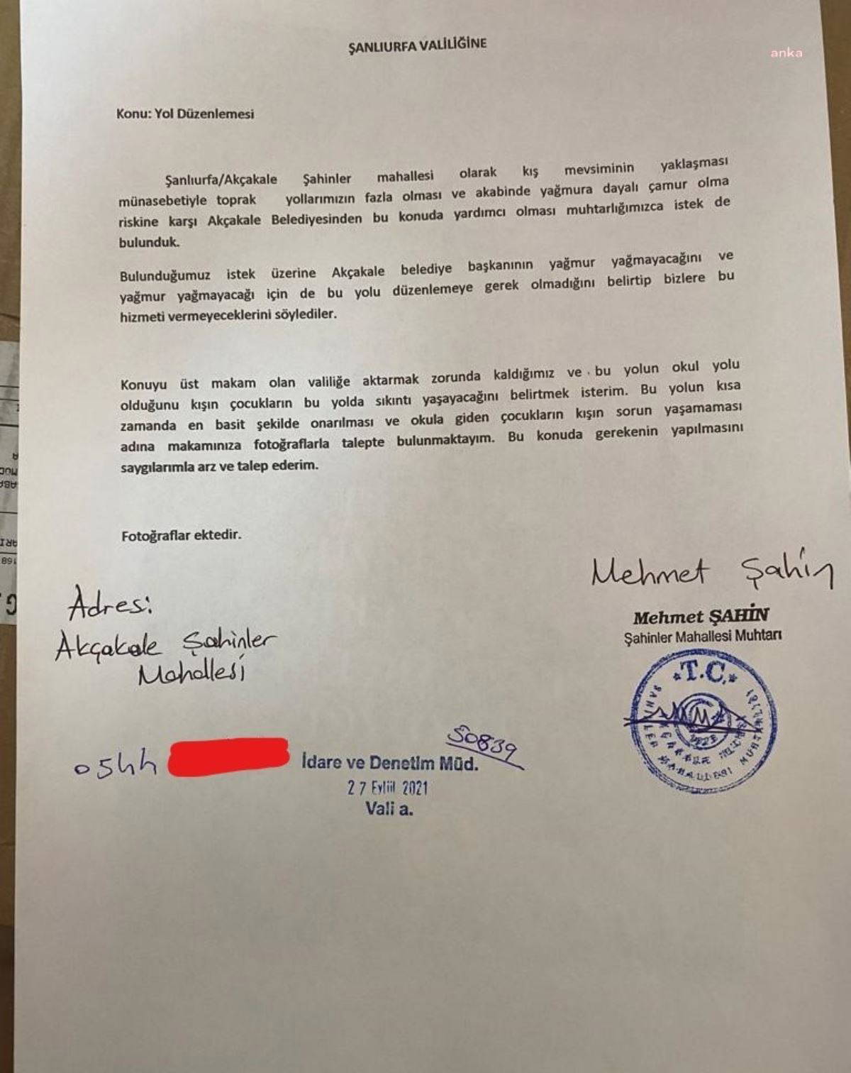 Mahmut Tanal, sosyal medya hesabından, Şahinler Mahallesi Muhtarı Mehmet Şahin’in Şanlıurfa Valiliği’ne yazmış olduğu dilekçeyi paylaştı.
