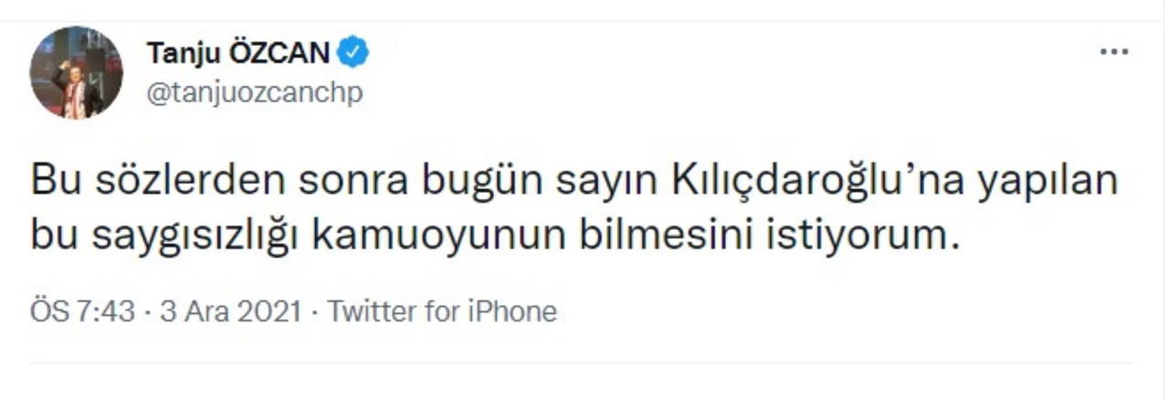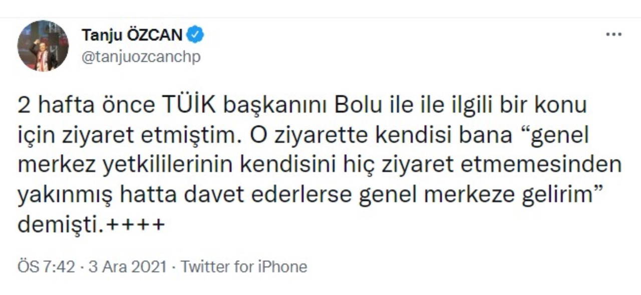 “2 hafta önce TÜİK başkanını Bolu ile ile ilgili bir konu için ziyaret etmiştim. O ziyarette kendisi bana ‘genel merkez yetkililerinin kendisini hiç ziyaret etmemesinden yakınmış hatta davet ederlerse genel merkeze gelirim’ demişti. Bu sözlerden sonra bugün sayın Kılıçdaroğlu’na yapılan bu saygısızlığı kamuoyunun bilmesini istiyorum.”