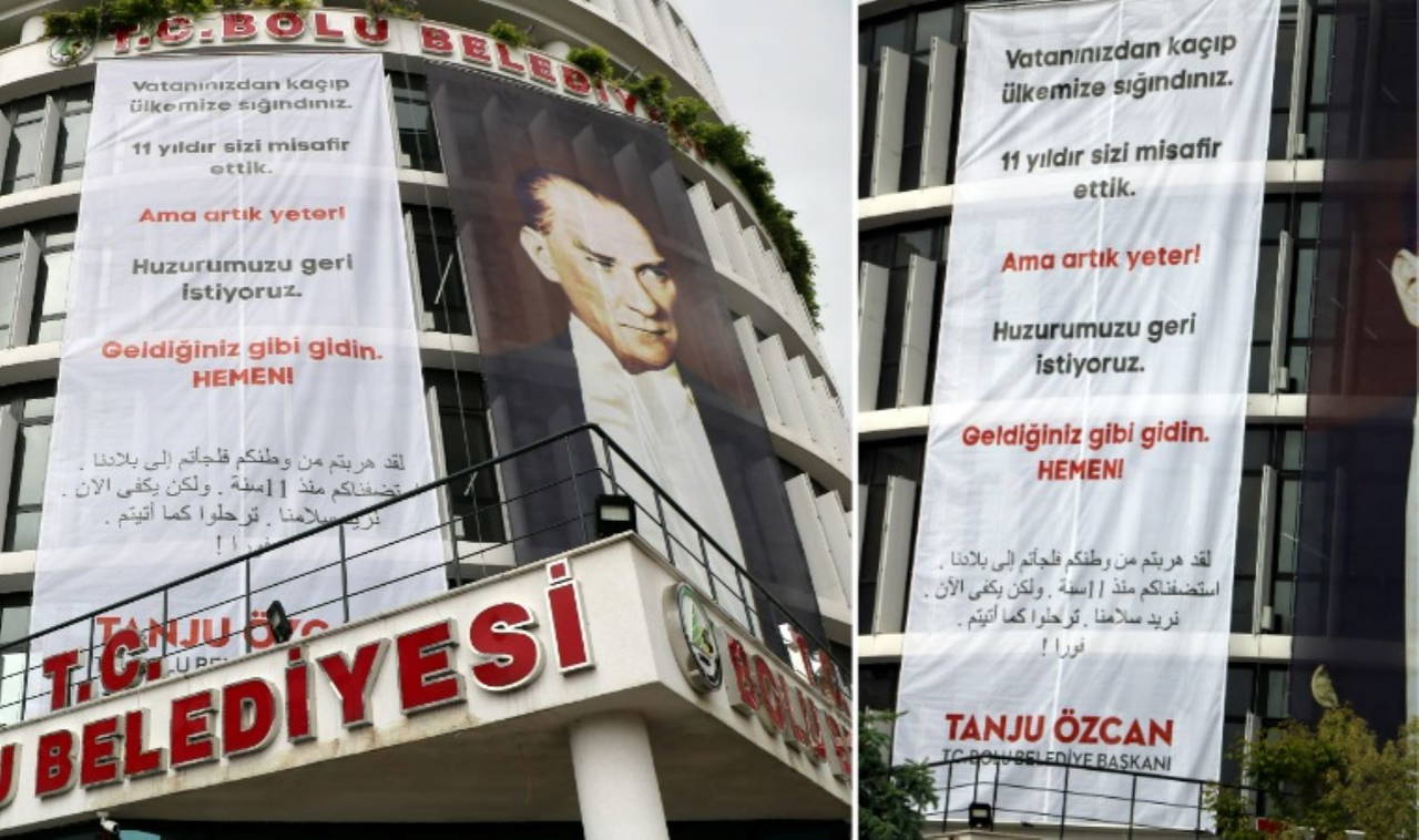 Demokrasi Meydanı’ndaki belediye binasının ön cephesine asılan Türkçe ve Arapça yazılı pankartta, “Vatanınızdan kaçıp ülkemize sığındınız. 11 yıldır sizi misafir ettik ama artık yeter. Huzurumuzu geri istiyoruz. Geldiğiniz gibi gidin hemen” ifadeleri yer aldı.