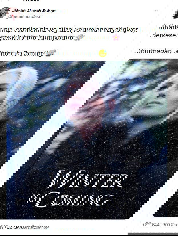 Bilecik Belediye Başkan vekili Melek Mızrak Subaşı, sosyal medyadan kendisine olan ilgiye fotoğrafını paylaşarak karşılık verdi. Subaşı, dizi karakterine benzediği fotoğrafı altına dizinin sloganını da ekleyerek, “İltifatlarınız, esprileriniz ve güzel yorumlarınızı görüyor, herkese teşekkürlerimi sunuyorum. Unutmadan, Winter Is Coming (Kış geliyor)” yazısıyla paylaştı. Melek Mızrak Subaşı, Bilecik Belediye Başkanı Semih Şahin'in görevden uzaklaştırılmasının ardından geçen yıl nisan ayında başkan vekilliğine seçilmişti. ,