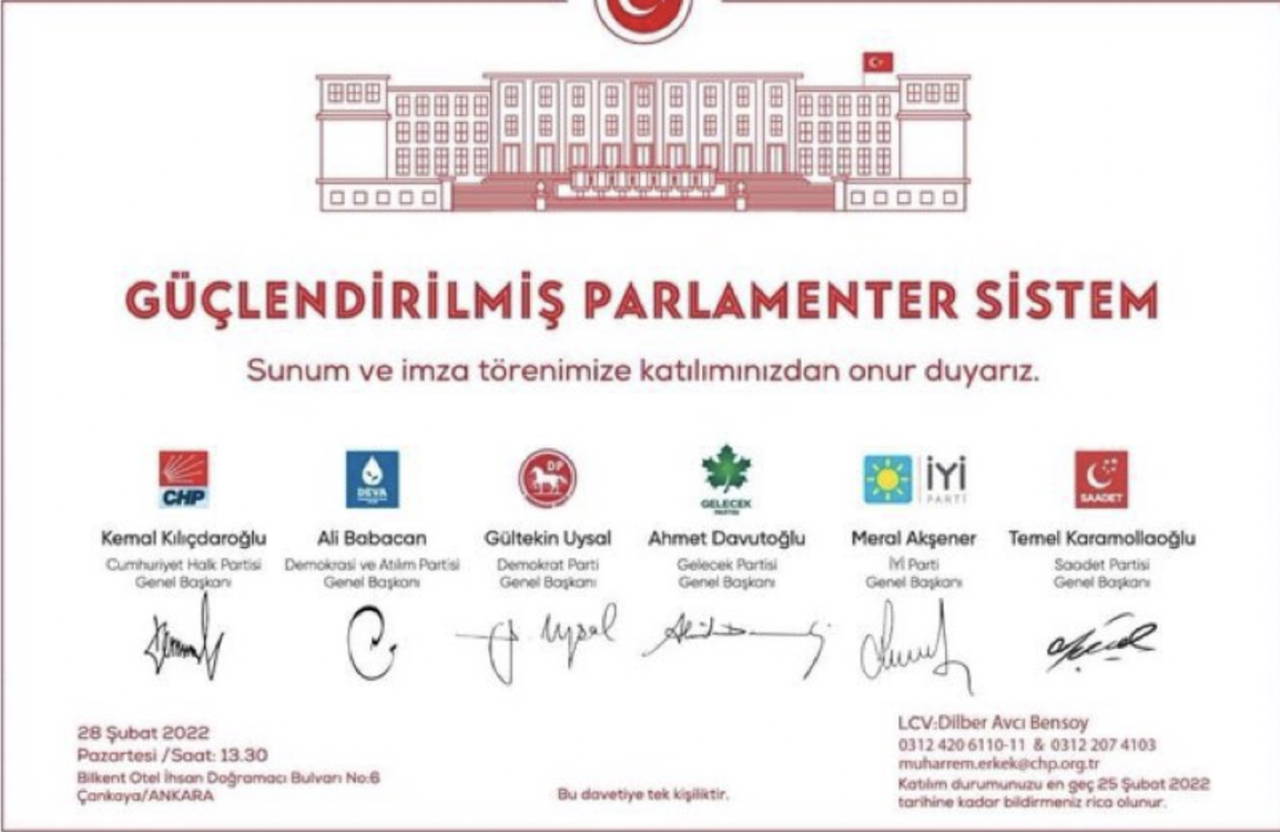 Güçlendirilmiş Parlamenter Sistem yazan davetiyede, 6 partinin logoları ve genel başkanlarının isimleriyle birlikte imzaları yer alıyor.