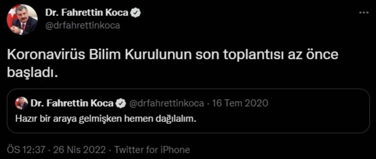 Koca, "Koronavirüs Bilim Kurulunun son toplantısı az önce başladı" dedi. Bakan Koca, söz konusu paylaşımı, 16 Temmuz 2020 tarihinde attığı ve "Hazır bir araya gelmişken hemen dağılalım" notunun yer aldığı tweeti alıntılayarak yaptı.