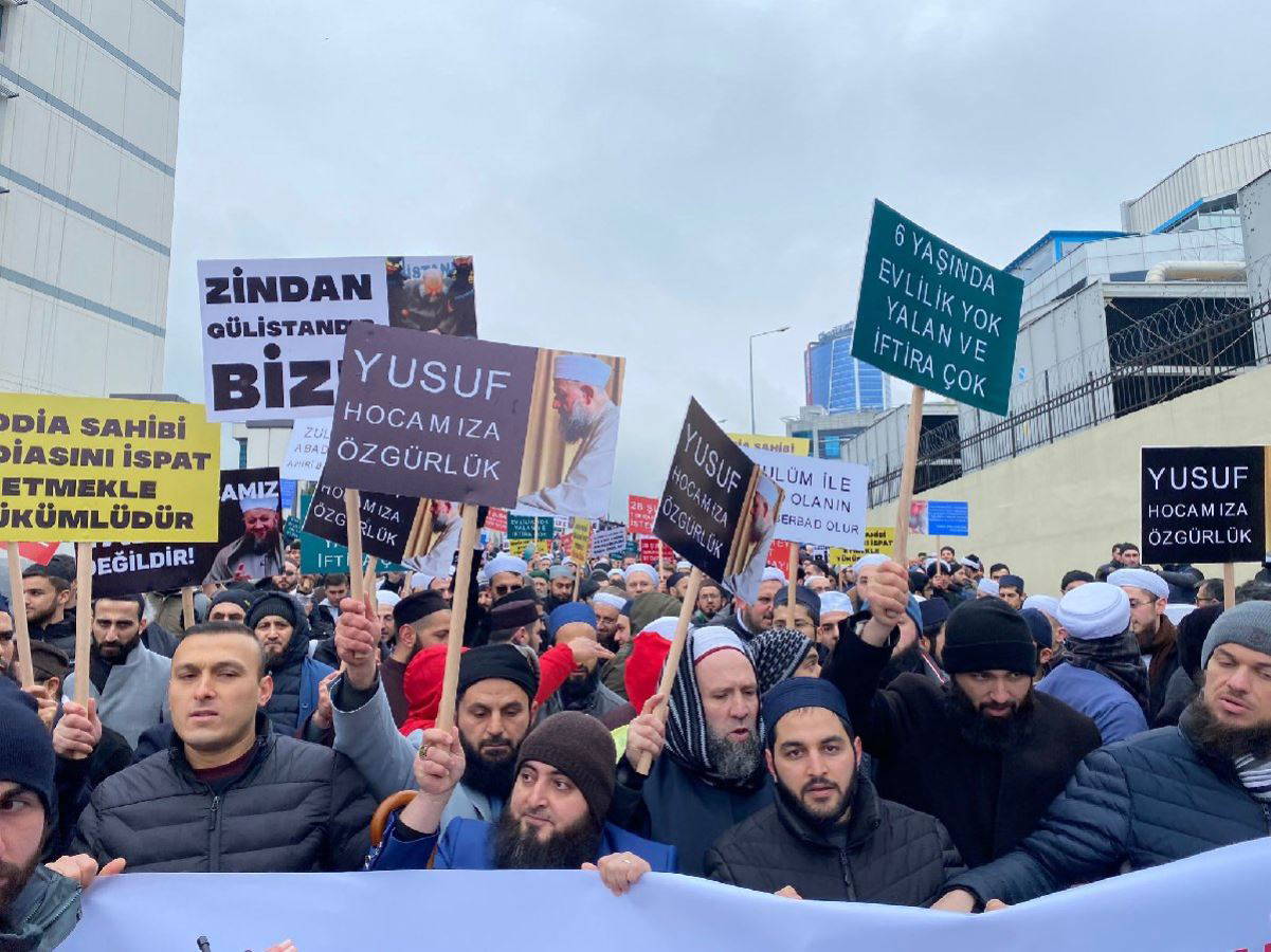 Çocuğa yönelik cinsel istismarı protesto için eylem yapan kadınların yanı sıra Hiranur Vakfı üyeleri de adliye önündeydi. Sarık ve cübbeli grup “Yusuf Hocamız yalnız değildir” sloganı atarak tekbir getirdi. Sanıklardan Gümüşel’in müritleri “Hocamıza özgürlük” yazılı pankartlar taşıdı.
