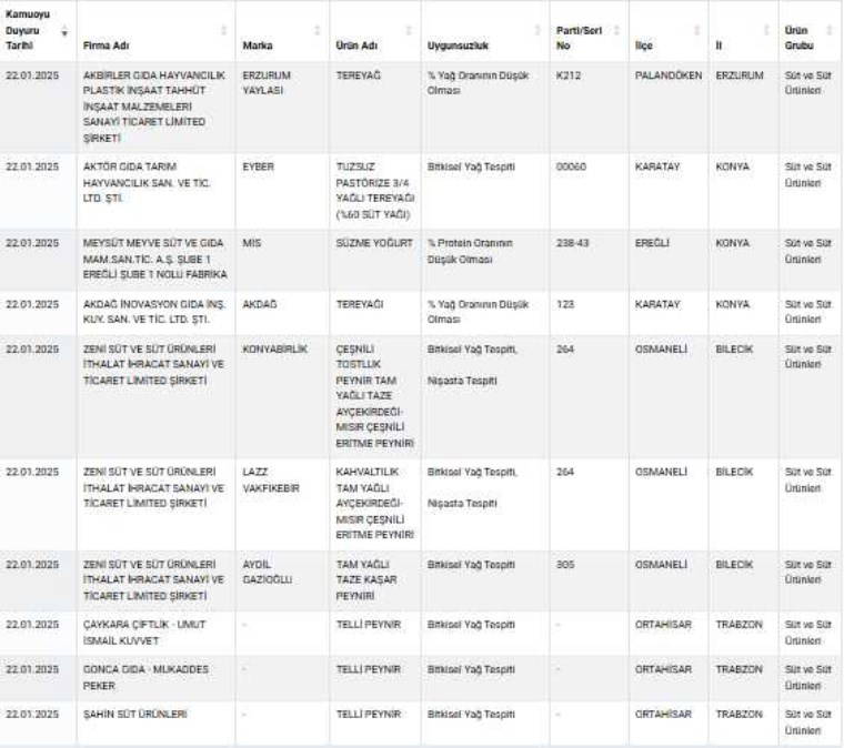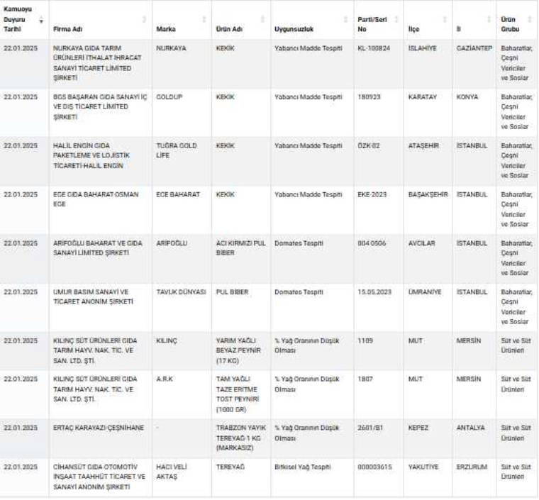 22 Ocak 2025 itibarıyla Tarım ve Orman Bakanlığı'nın açıkladığı taklit ve tağşiş listesine eklenen yeni ürün ve markalar şu şekilde: