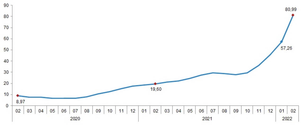 Tarım-GFE'de 2022 yılı şubat ayında bir önceki aya göre yüzde 16,69, bir önceki yılın aralık ayına göre yüzde 28,50, bir önceki yılın aynı ayına göre yüzde 80,99 ve on iki aylık ortalamalara göre yüzde 36,85 artış gerçekleşti.