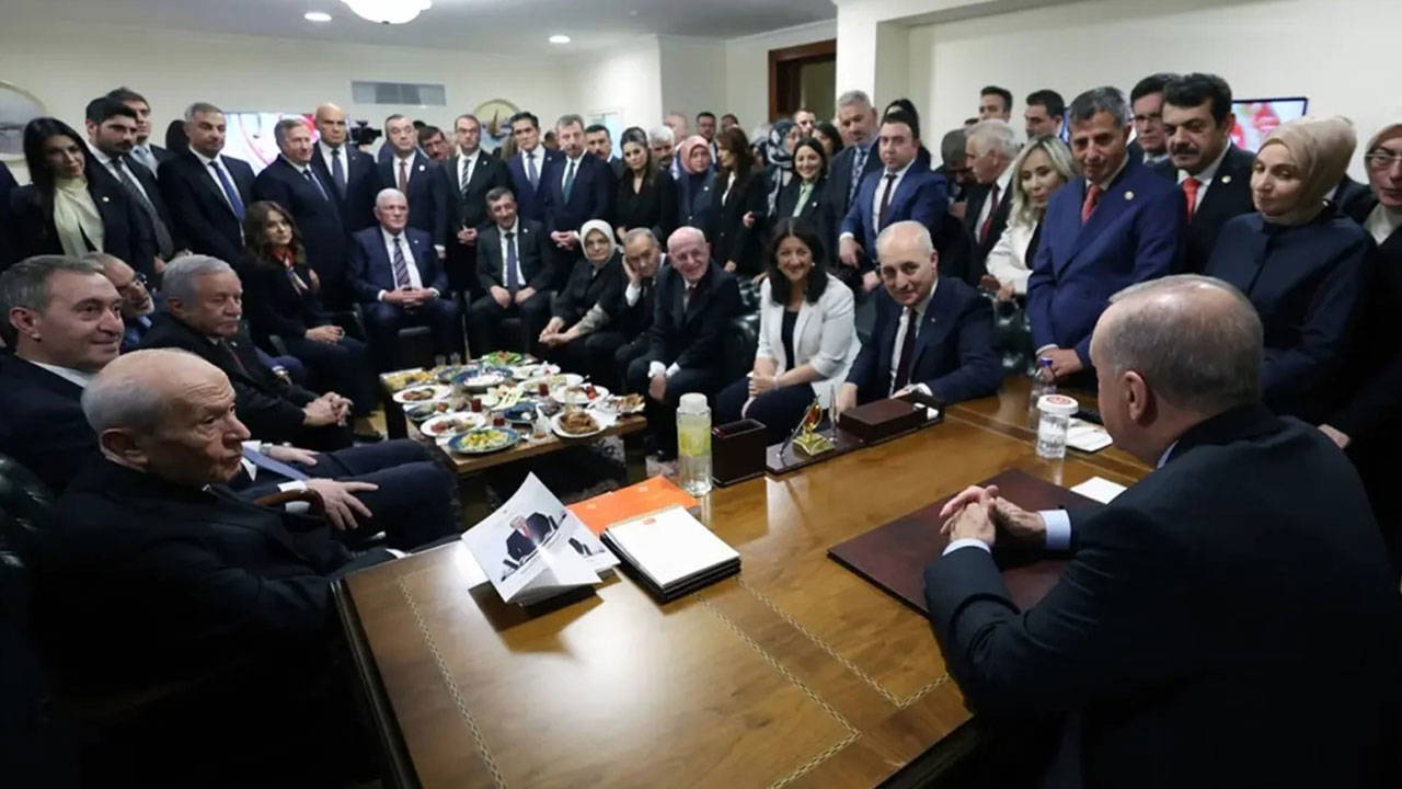 Erdoğan, beraberinde TBMM Başkanı Numan Kurtulmuş ve Bahçeli ile oradan ayrılırken gazetecilerin "İYİ Parti ile de ilk kez bir araya geldiniz, CHP yoktu ama hepsiyle bir araya geldiniz. Bir değerlendirmeniz olur mu", "Görüşme nasıl geçti" soruları üzerine "Samimi bir havada görüşmemizi yaptık, sağ olsun liderlerle beraber... Keşke siz de beraber olsaydınız" dedi.