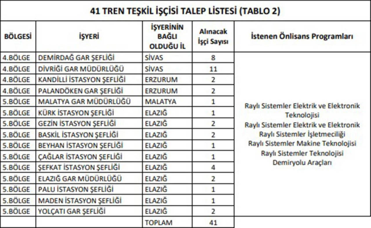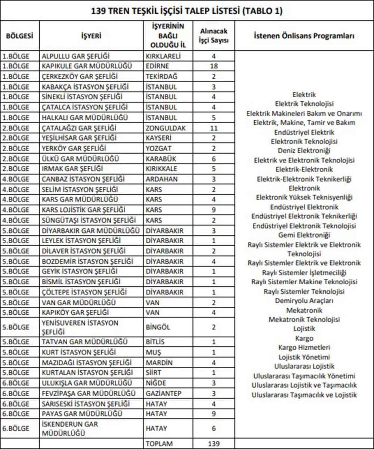 TCDD İŞÇİ ALIMI KADRO DAĞILIMI