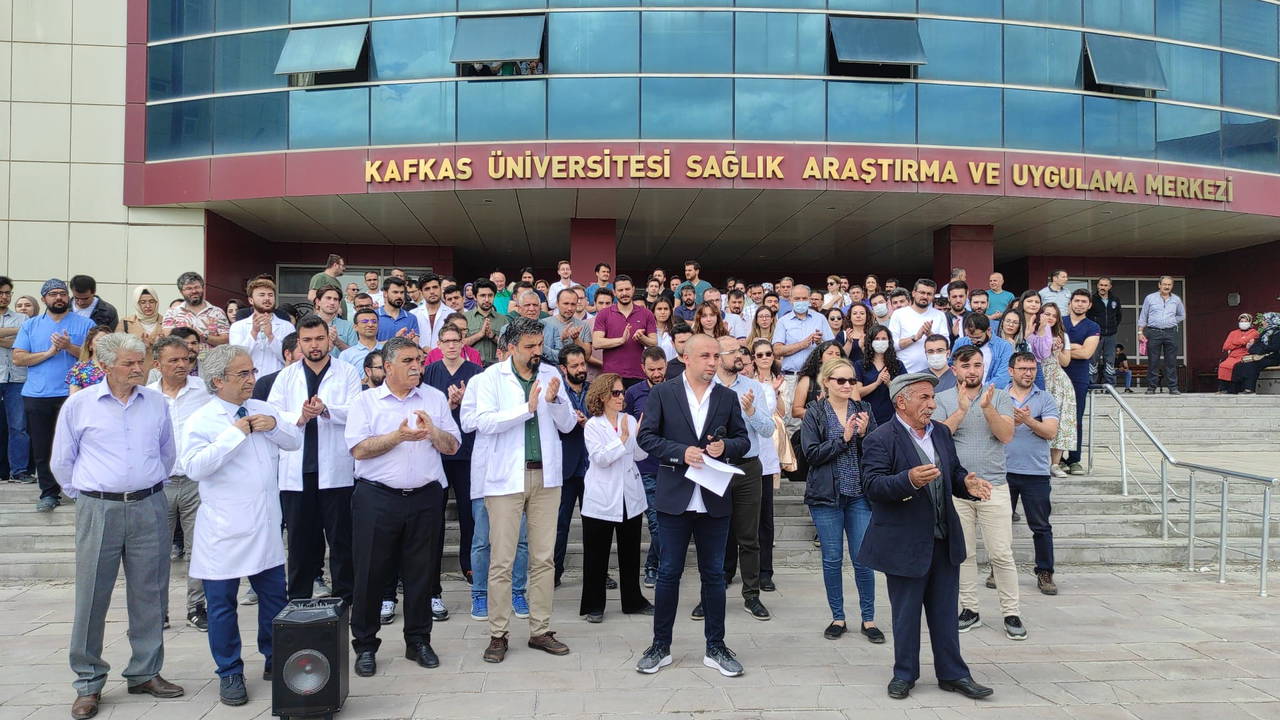 Kars Harakani Devlet Hastanesi ve Kafkas Üniversitesi Sağlık Araştırma ve Uygulama Hastanesi doktorları, bıçaklı saldırıya uğrayan meslektaşları için bugün iş bırakma eylemi yaptı.