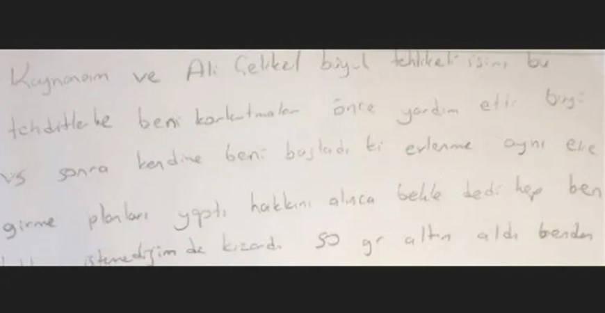 G.D.'nin aracında bulunan intihar mektubunda, "Beni bu duruma düşüren Ali Çelikel büyük tehlikeli. Beni kendine bağladı, aynı eve girme planları yaptı. Sonra oyalamaya başladı. Tehditler edip, geceleri beni korkutarak paramı aldı. Konya'ya yanına gittim, silah çıkardı. Zor çıktım, beni öldürecekti. Hep bir oyun içindeymişim. Bana ne kötülük varsa yapacağını söyledi. Artık yaşamak istemiyorum. Hep uğraşacak. Ben artık dayanamıyorum" ifadeleri yer aldı.