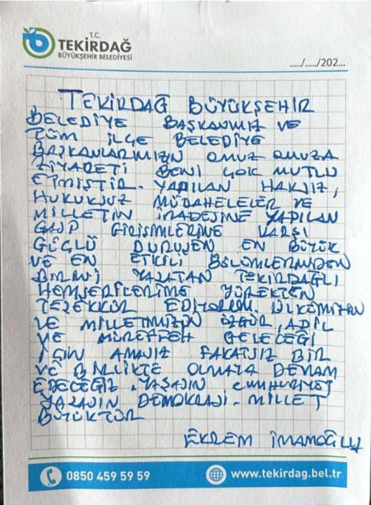 ''Tekirdağ Büyükşehir Belediye Başkanı tüm ilçe belediye başkanlarımızın omuz omuza ziyareti beni çok mutlu etmiştir. Yapılan haksız, hukuksuz müdahaleler ve milletin iradesine yönelik gasp girişimlerine karşı güçlü duruş, en güçlü ve en etkili bölümlerinden birini yaratan Tekirdağlı hemşerilerime yürekten teşekkür ediyorum. Ülkemizin ve milletimizin özgür, adil ve müreffeh geleceği için amasız fakatsız birlikte olmaya devam edeceğiz. Yaşasın cumhuriyet. Yaşasın demokrasi. Millet büyüktür.''