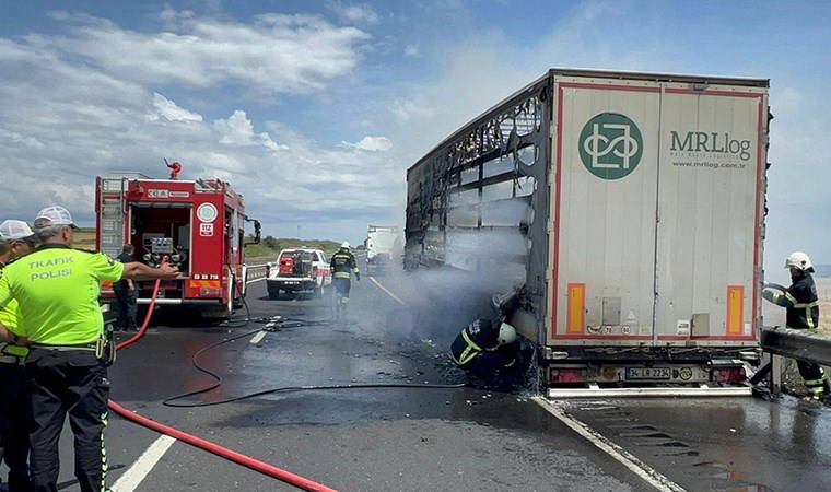 Yunanistan'dan aldığı alüminyum kapak yükünü Tekirdağ'ın Çerkezköy ilçesindeki fabrikaya götüren Yakup Gevşek yönetimindeki 34 LR 2234 plakalı TIR'ın dorsesi, çevre yolunda alev aldı.