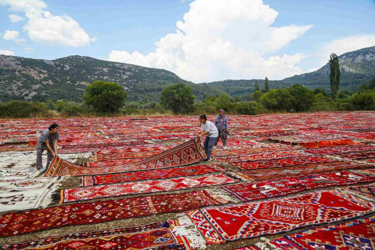 Halı tarlasından sorumlu Ayşe Akbaba, 80 dönümlük alanın tamamen halıyla dolduğunu belirtti. Akbaba, "Sezonu açtığımız gün halılar gelmeye başladı. İlgi yoğun. 120 dönüme kadar alanın çıkacağını tahmin ediyoruz. Halılarımız 6 bini bulur. Şu an 3-4 bin civarı. Halılarımızı pastel rengini alması için bu şekilde güneşlendiriyoruz. Genelde kadınlarımız çalışıyor. Onların el emeği çok. Gençlerimize de bu sevgiyi kazandırmaya çalışıyoruz" dedi.