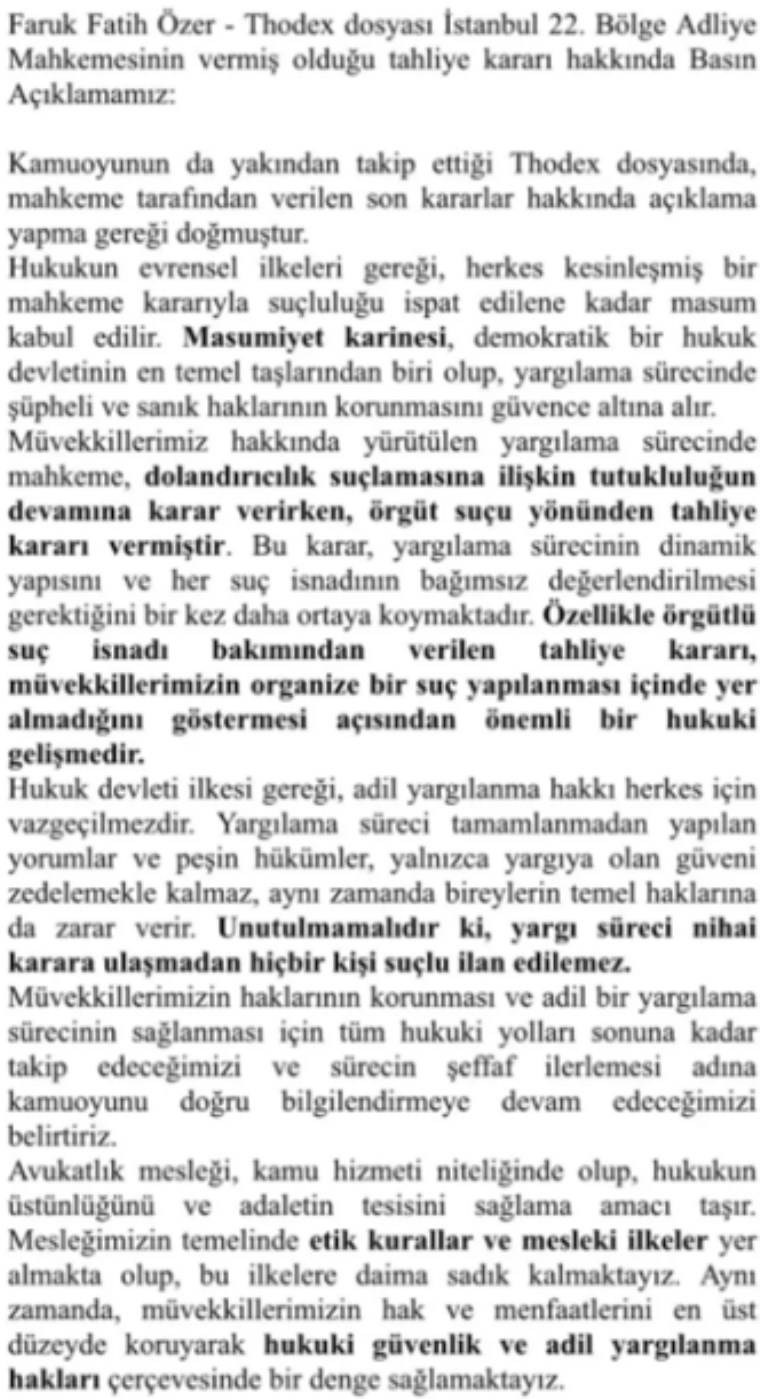 "Kamuoyunun da yakından takip ettiği Thodex dosyasında, mahkeme tarafından verilen son kararlar hakkında açıklama yapma gereği doğmuştur. Müvekkillerimiz hakkında yürütülen yargılama sürecinde mahkeme, dolandırıcılık suçlamasına ilişkin tutukluluğun devamına karar verirken, örgüt suçu yönünden tahliye kararı vermiştir. Özellikle örgütlü suç isnadı bakımından verilen tahliye kararı, müvekkillerimizin organize bir suç yapılanması içinde yer almadığını göstermesi açısından önemli bir hukuki gelişmedir."
