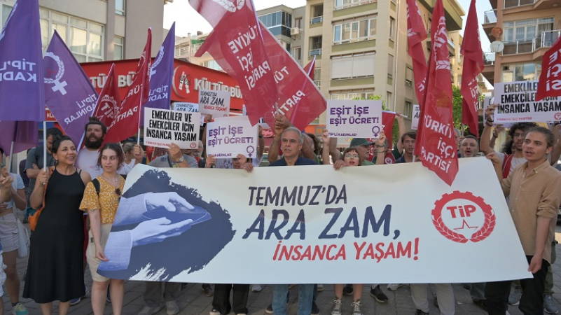 “Temmuzda asgari ücrete ara zam, insanca yaşam” pankartı açan partililer, “Emekliler ve emekçiler için insanca yaşam”, “Eşit işe eşit ücret” dövizleri taşıdı. Grup adına basın açıklamasını okuyan TİP Parti Meclisi Üyesi Orhan Kiper, “Emekçinin emeklinin ve kadının hakları için mücadeleye devam!” dedi.