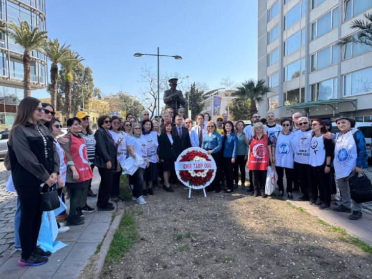 Basın açıklamasının ardından İzmir Tabip Odası Yönetim Kurulu Başkanı Prof. Dr. Mehmet Ceyhun Özyurt, yönetim kurulu üyeleri ile sağlık çalışanları Cumhuriyet Meydanı'ndaki Atatürk anıtına ve İzmir Ticaret Odası binası önünde bulunan İstanbul’un işgaline karşı 14 Mart 1919’da başlatılan "Tıbbiyeli Hareketi"nin önderi olarak bilinen Tabip Yarbay Hikmet Boran'ın anıtına çelenk bıraktı.