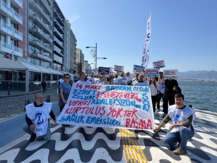 "Bu 14 Mart’ta biz hekimler ve tüm sağlık emekçileri; meslek onurumuz ve halkın sağlığı için bir aradayız. Ayaklar altında olan sadece meslek onurumuz değil, aynı zamanda halkın nitelikli sağlık hizmetine erişme hakkı, herkese eşit ve ücretsiz sağlık hizmet hakkı, gerekli olan tüm tıbbi ilaç ve malzemeyi temin edebilme hakkı. ?Bir hekimin 100. hastası olmama hakkı, tüm hekimlerin ve sağlık çalışanlarının çağdaş, nitelikli, yeterli muayene sürelerinde, şiddetsiz-güvenli binalarda ve ortamlarda çalışma hakkı, ??ek ödeme ile değil; her ay düzenli tek ödeme ile refah içinde geçinebilme hakkı,