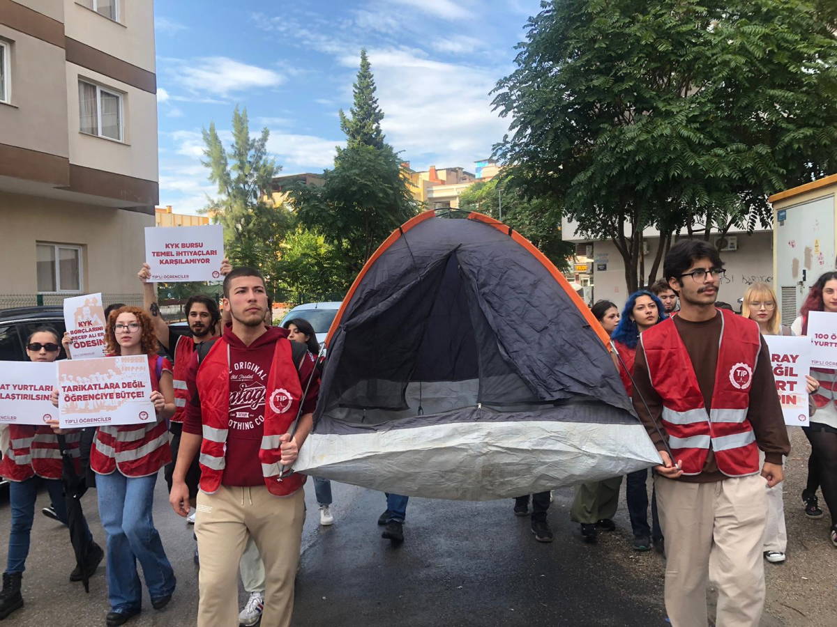 Kamp çadırı ile yurt önüne gelen öğrenciler ellerinde “100 öğrenciden 8’i yurtta kalabiliyor”, “Saray değil yurt yapın”, “Öğrenci evlerine kira ve fatura desteği yapılsın”, “KYK bursu temel ihtiyaçları karşılamıyor”, “KYK borçlarını Recep Ali Er ödesin”, “İnsani koşullarda yurtta yaşamak istiyoruz” yazılı pankartlar tuttular.