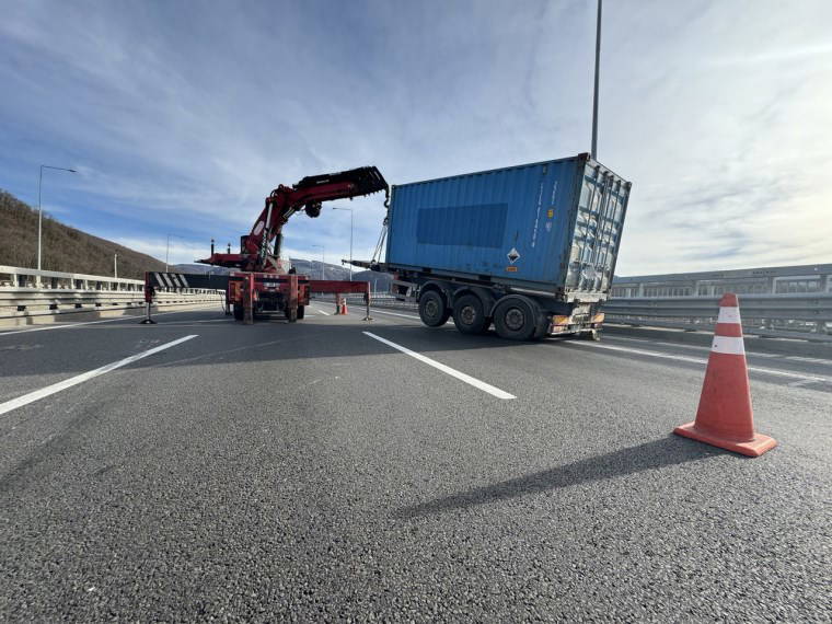 Ekipler, dubalar ve uyarıcı levhalarla yol güvenliğini sağladıktan sonra dorsenin kaldırılması için trafik akışını durdurdu.