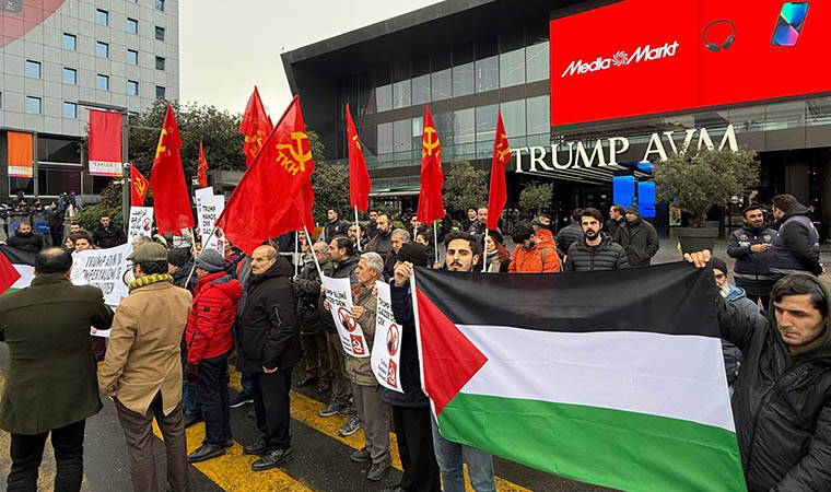 Türkiye Komünist Hareketi (TKH) ABD ve İsrail’in Gazze'yi işgal planına tepki göstermek için Mecidiyeköy’deki Trump Tower önünde eylem yaptı.