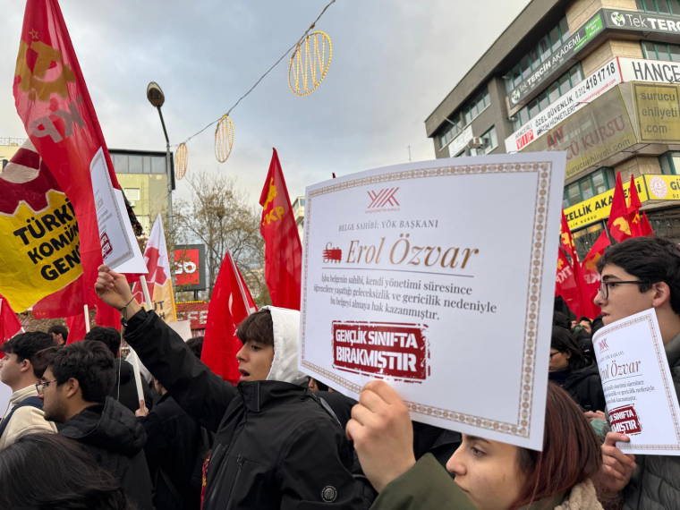 Gençler, elinde tuttuğu dövizlerle YÖK Başkanı Erol Özvar’a da diploma verdi. Diplomanın üzerinde, “İşbu belgenin sahibi, kendi yönetimi süresince öğrencilere yaşattığı geleceksizlik ve gericilik nedeniyle bu belgeyi almaya hak kazanmıştır. Gençlik sınıfta bırakmıştır” yazısı yer aldı.