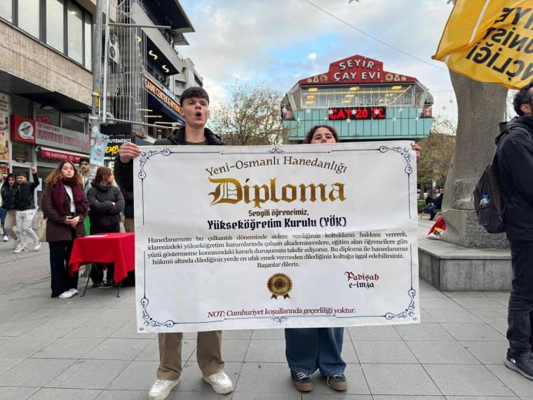 Diplomanın üzerinde, hayali olarak oluşturulmuş bir “Yeni Osmanlı İmparatorluğu” yazısı yer aldı. Altında ‘diploma’ yazan pankartta, “Hanedanımızın bu çalkantılı döneminde sizlere verdiğimiz koltukların hakkını vererek, idarenizdeki yükseköğretim kurumlarında çalışan akademisyenlere, eğitim alan öğrencilere gün yüzü göstermeme konusundaki kararlı duruşunuzu takdir ediyoruz. Bu diploma ile hanedanımız hükmü altında dilediğiniz yerde en ufak emek vermeden dilediğiniz koltuğu işgal edebilirsiniz. Başarılar dileriz” ifadelerine yer verildi.