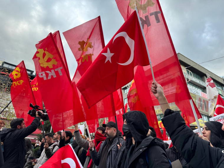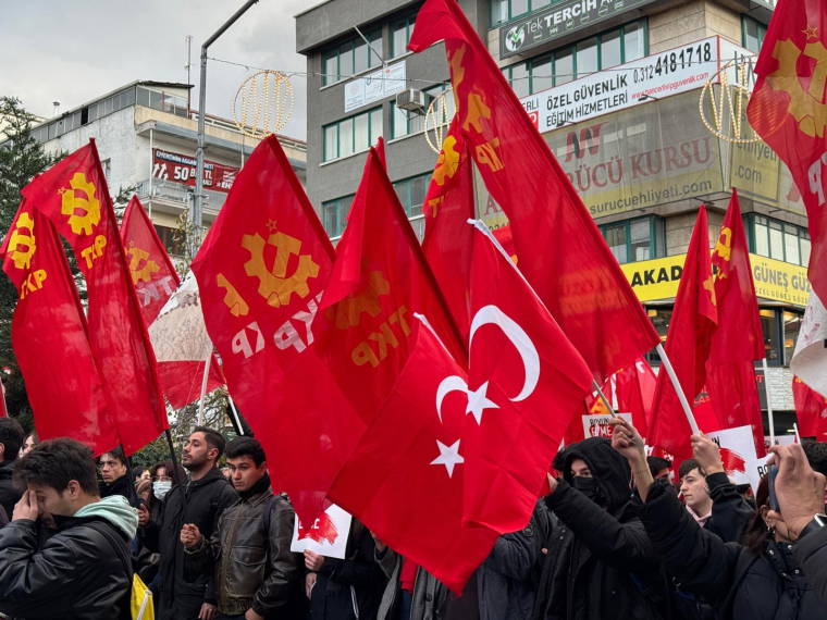 Türk bayrağıyla birlikte TKP flamaları tutan gençler, “Boyun eğme memlekete sahip çık, AKP’den hesabı gençlik soracak, Eşit özgür tam bağımsız Türkiye, Hükümet istifa” sloganları attı.