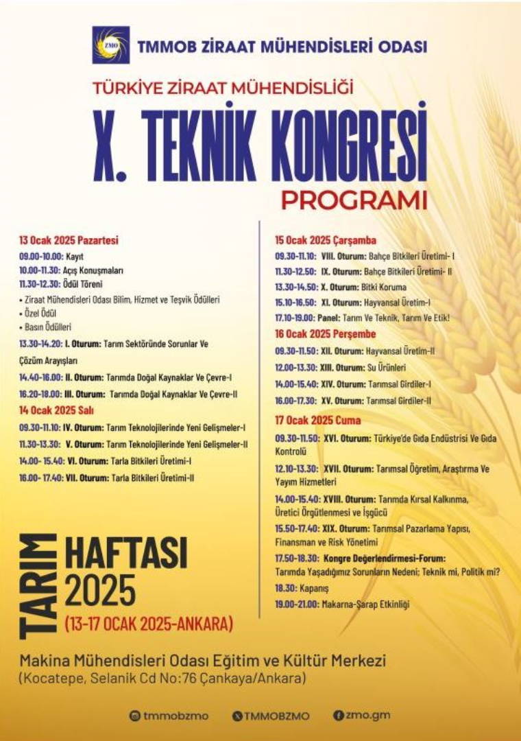 TMMOB Ziraat Mühendisleri Odası, 10’uncu Teknik Kongresi’ni düzenliyor. Tarımdaki güncel koşullar, sorunlar ve çözümleriyle birlikte teknolojik görüşmelerin konuşulacağı paneller ve oturumlardan oluşan kongre, 13-17 Ocak günleri arasında gerçekleştirilecek. 5 gün sürecek kongre, Ankara’nın Çankaya ilçesinde bulunan Makina Mühendisleri Odası Eğitim ve Kültür Merkezi’nde yapılacak.