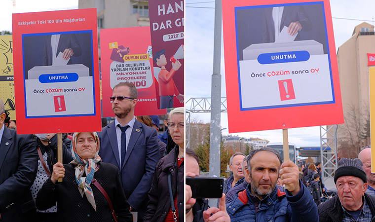 Eskişehir TOKİ mağdurları, bugün Ulus Anıtı önünde bir araya gelerek basın açıklaması yaptı. Hükümete seslerini duyurmaya çalışan vatandaşlar, “Çözüm yoksa oy da yok” sloganlarını tekrarlayarak taleplerinin yerine getirilmesini istedi.