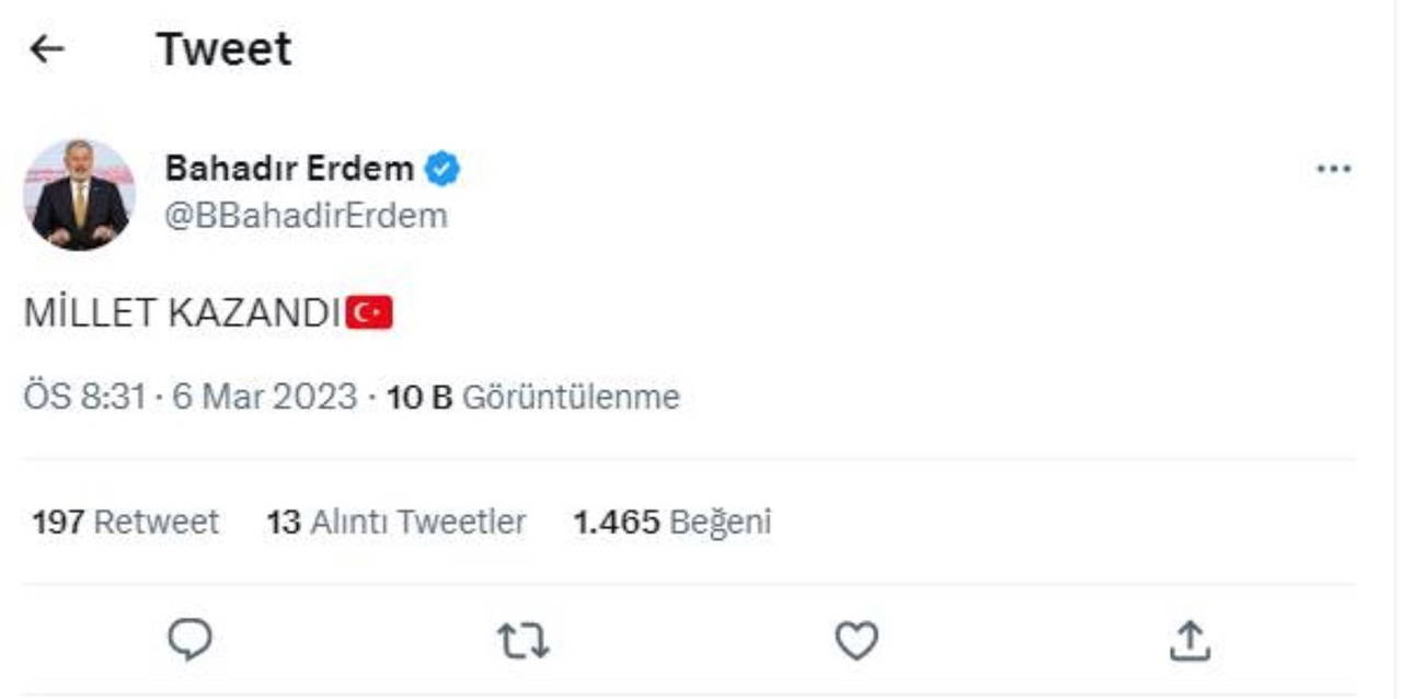 Saat 19.15 itibarıyla sona eren toplantının ardından ilk açıklama İYİ Parti'den geldi. İYİ Parti Genel Başkanı Yardımcısı Bahadır Erdem, sosyal medya hesabından "Millet kazandı" paylaşımını yaptı.