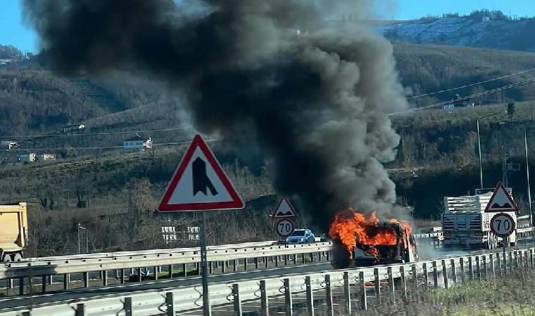 Durumu fark eden Çalış, aracını yolun sağına çekerek ailesiyle birlikte indi. Büyüyen alevler, kısa sürede aracı sardı.