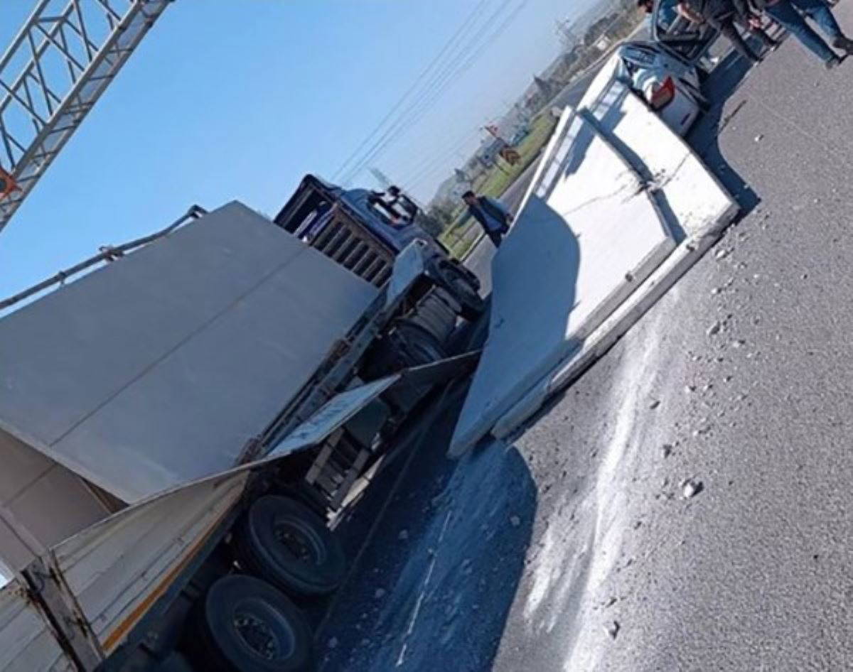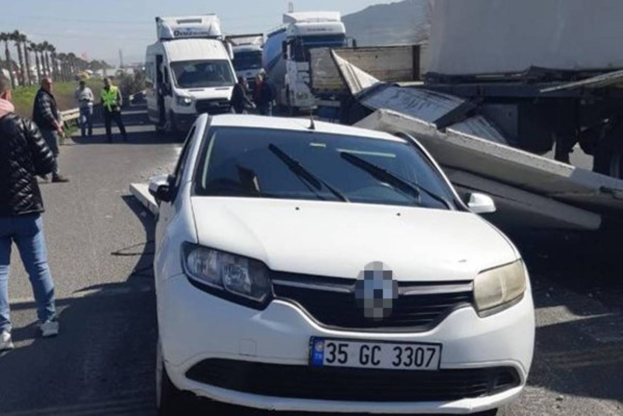 İzmir-Çanakkale Yolu Biçerova Kavşağı’nda önceki gün saat 15.45 sıralarında; Menemen’den Aliağa istikametine giderken trafik ışıklarında bekleyen E.A. idaresindeki 35 GC 3307 plakalı otomobilin üzerine sol tarafında bekleyen O.S. idaresindeki 35 ARR 518 plakalı TIR'n kasasında yüklü olan panel duvar devrildi.